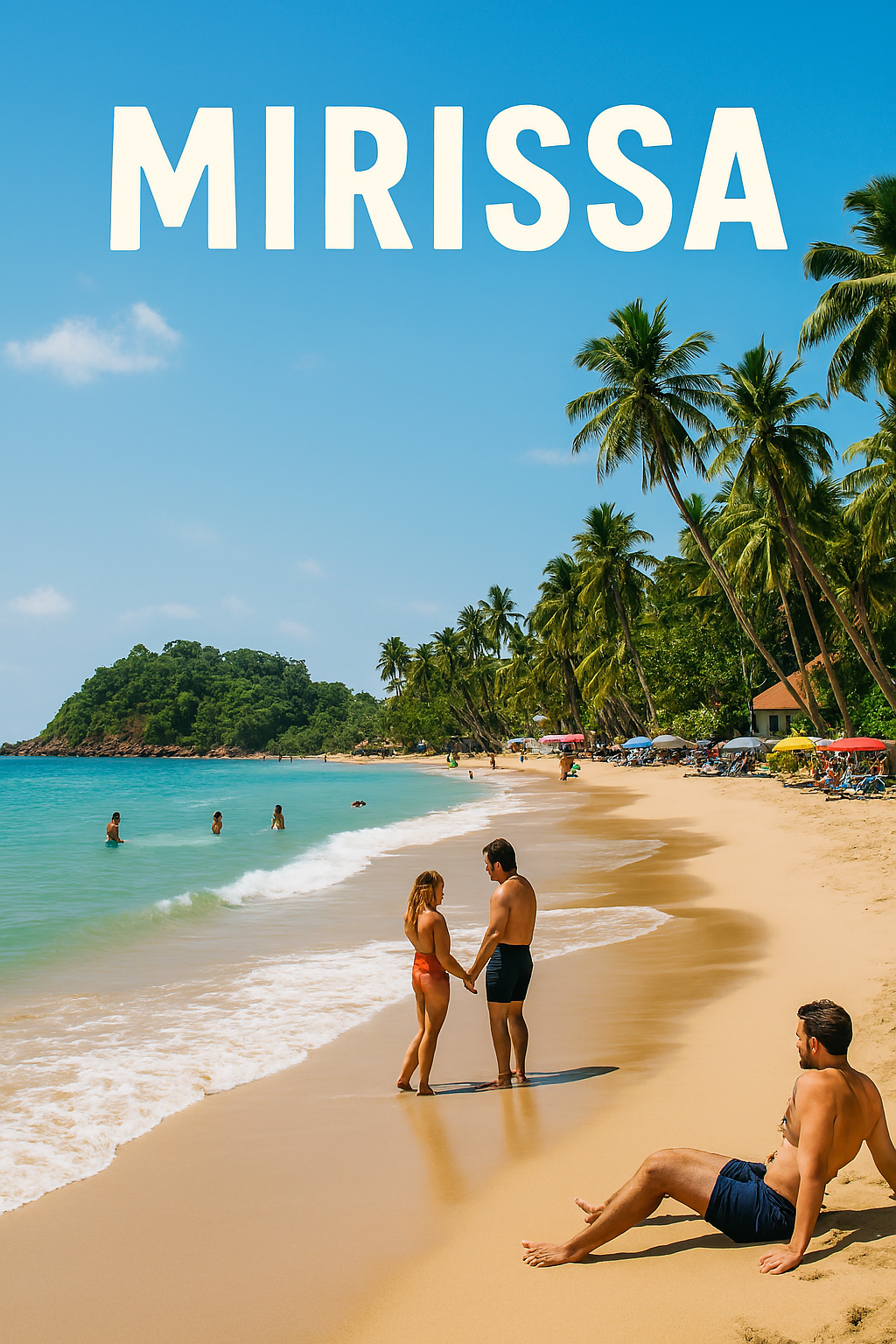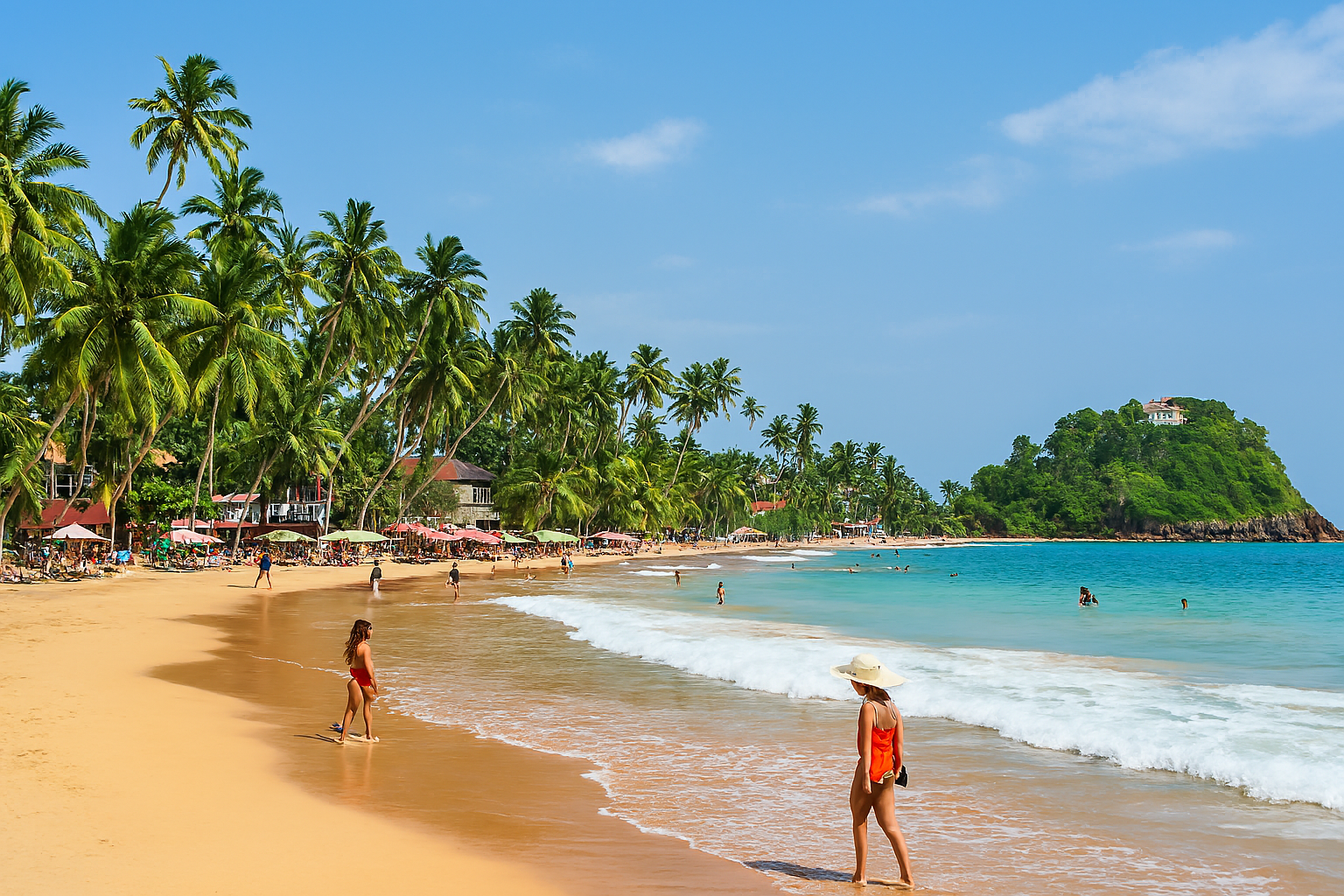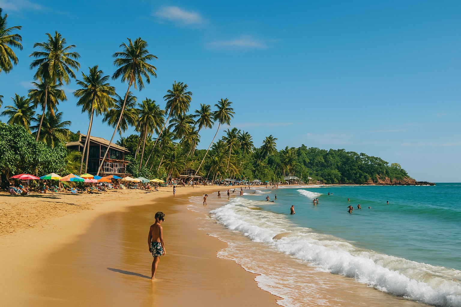 Beach bars lit up under palm trees with people dining and music playing.