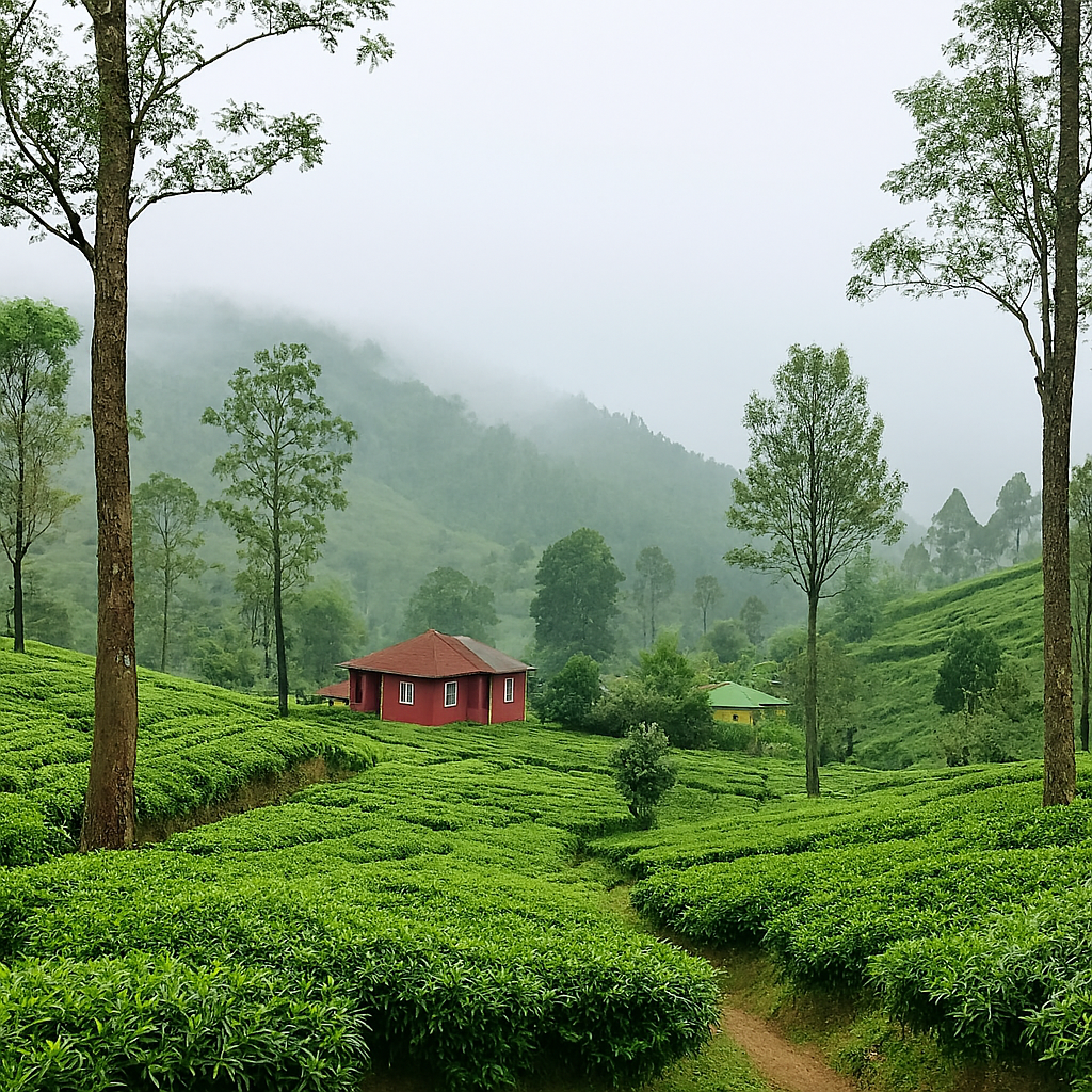 Rolling terraced hills with tea pickers in traditional attire and misty mountain backdrops.
