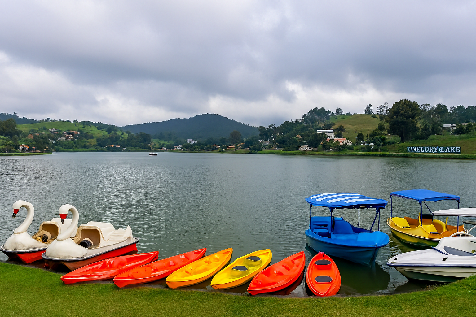 A tranquil lake surrounded by green hills, paddle boats, and colonial-style buildings.